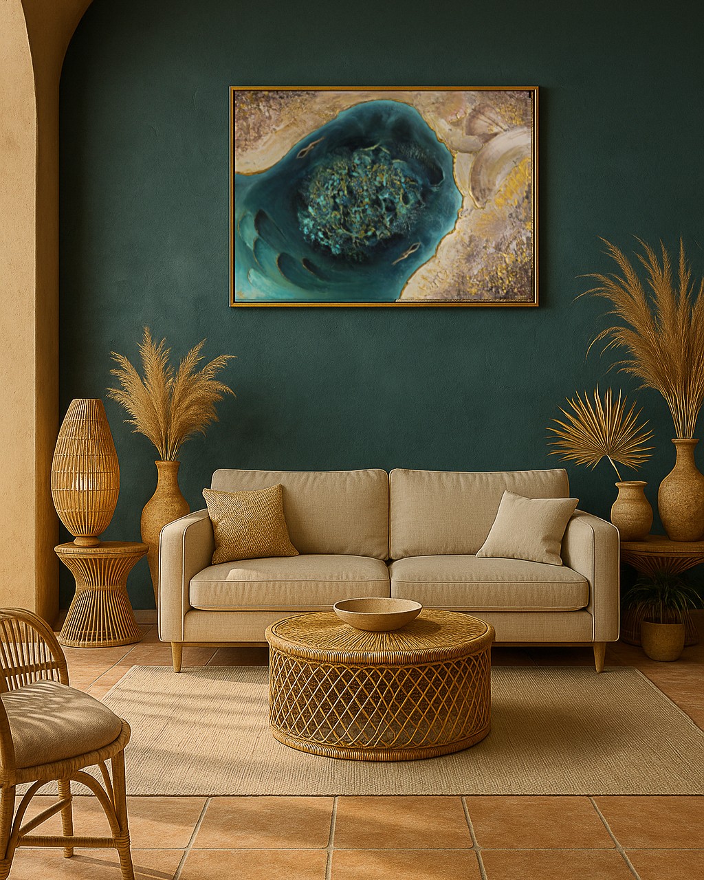 Costa Del Sol captures the mesmerizing moment where land meets sea – a place of warmth, fluidity, and contrast. Here, the golden shoreline glows under layers of radiant texture and shimmering metallics, while the rich blues of the ocean beckon the viewer into a world of depth and mystery. It is a meeting point of elements, where opposites coexist in harmony.